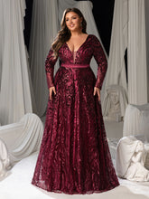 Plus Womens' Elegant Lace & Sequin Evening Gown - V-Neck Long Sleeve Design with Cinched Waist & Flowing A-Line Skirt for Coastal Weddings, Luxury Evening Events