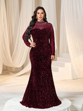 Plus Elegant Maxi Sequin Evening Gown with Mock Neck, Long Sleeves, and Mermaid Fishtail Skirt