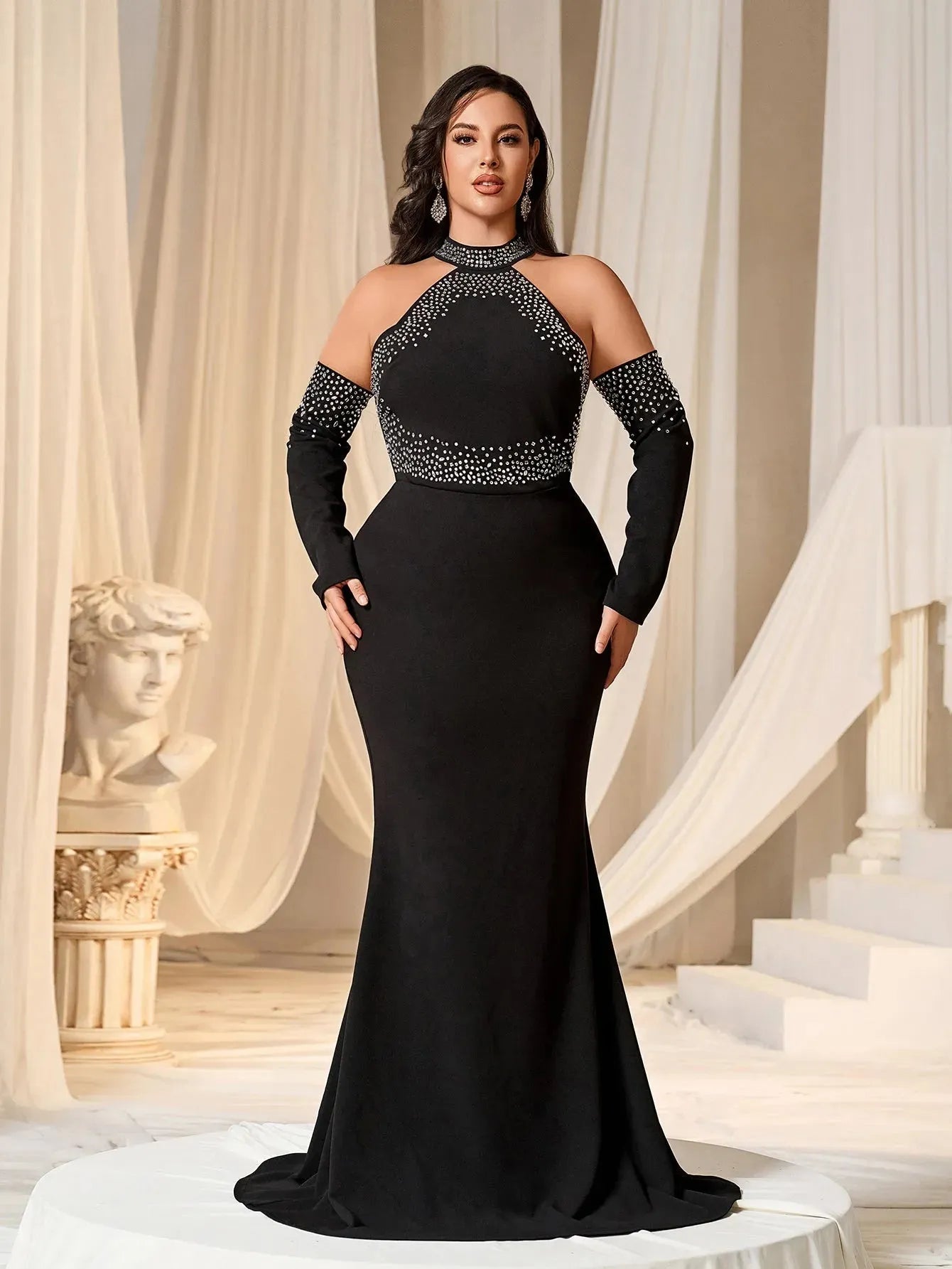 Turn heads with our chic halter neck gown. This sophisticated dress features a high halter neckline adorned with sparkling rhinestones, adding a touch of glamour to the minimalist design. The fitted silhouette flatters your figure, while the floor-length skirt ensures an elegant appearance. The detachable sleeves, embellished with matching rhinestones, offer versatility and an extra hint of sophistication.