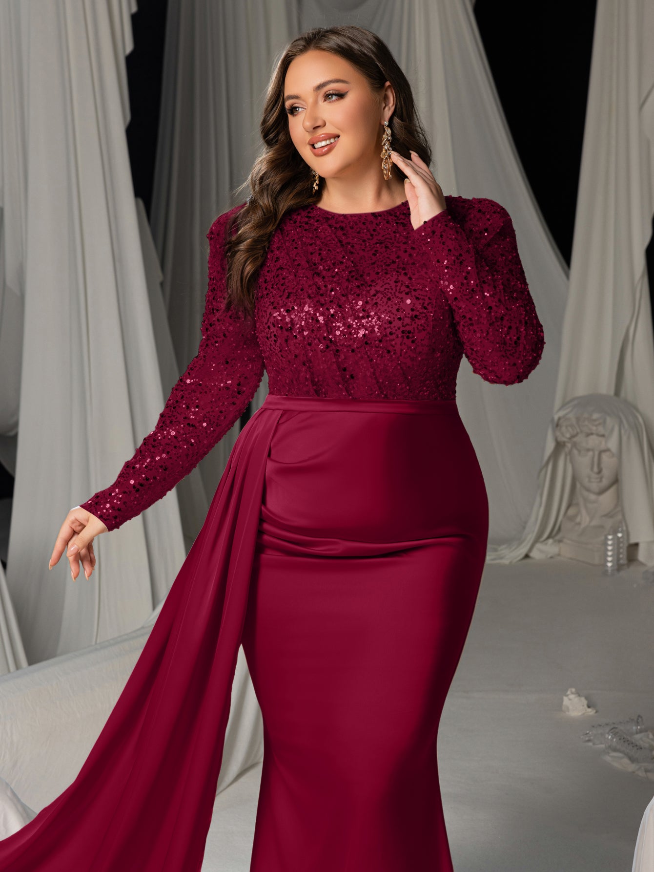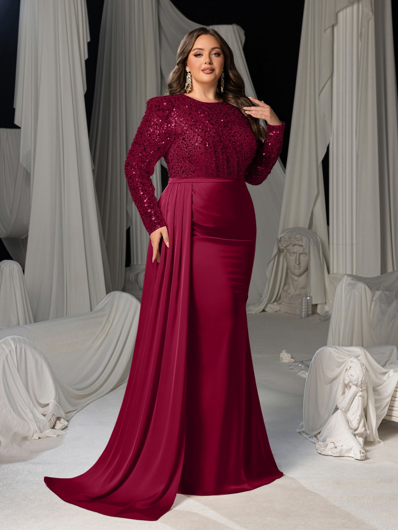 Regal Radiance: The round-neck sequined gown features a structured long-sleeve bodice adorned with thousands of shimmering sequins, sculpting curves while radiating sophisticated glamour.