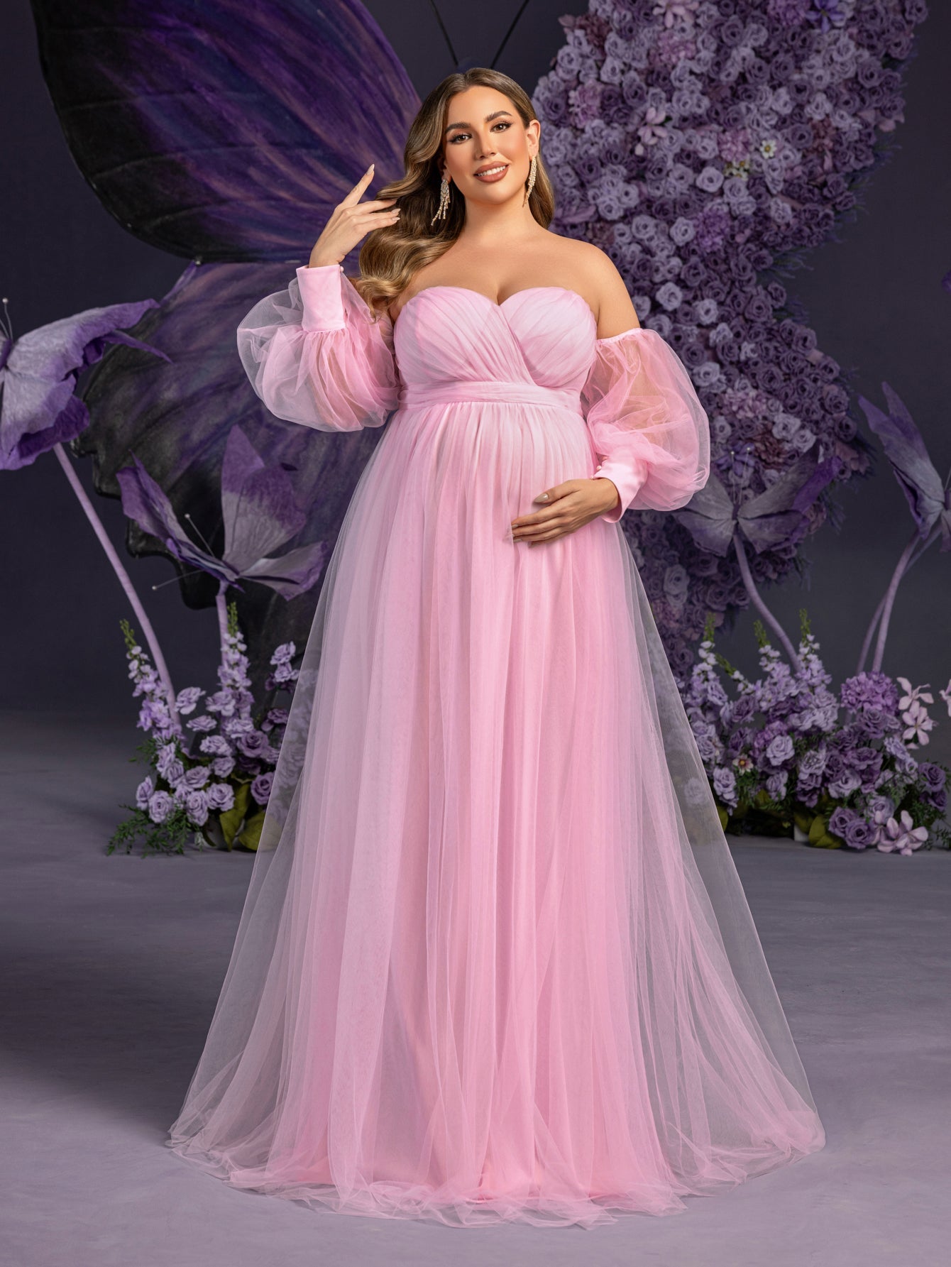 Plus Maternity  Off-Shoulder Evening Gown with Puff Sleeves – Flowy Tulle Dress for Pregnancy Photoshoots & Baby Showers