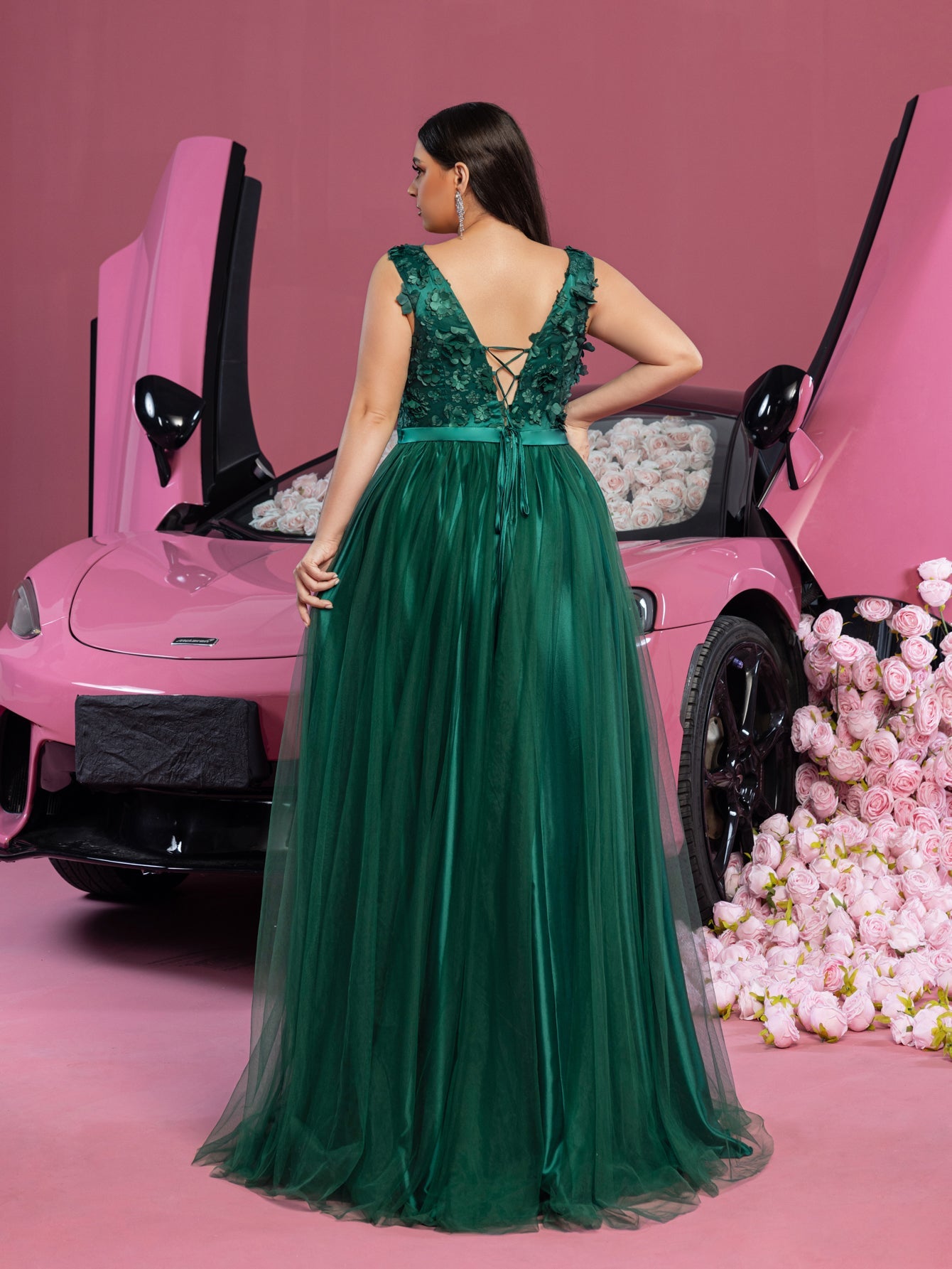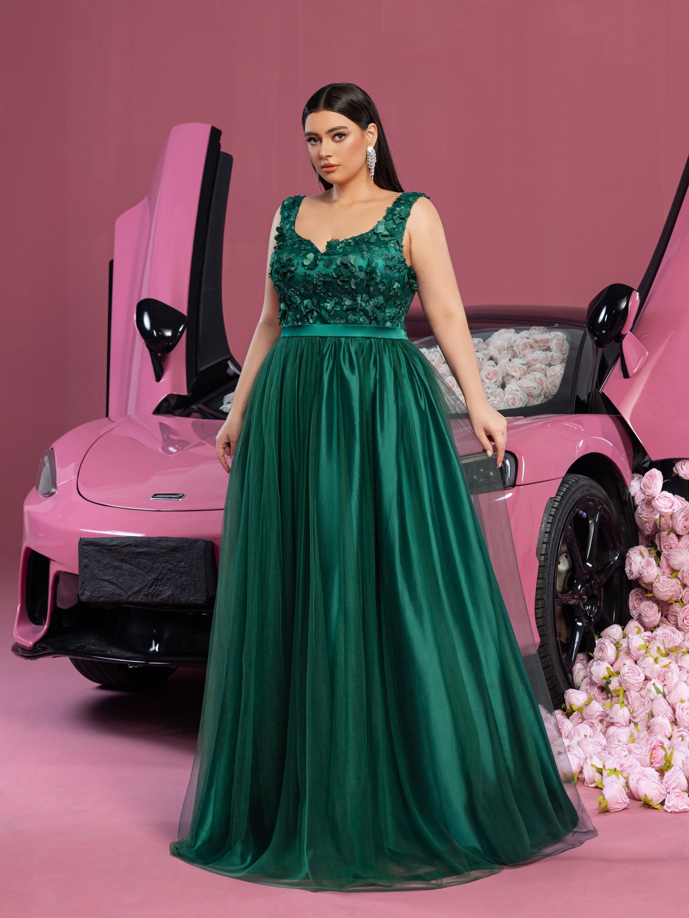 Plus Elegant Scoop Neck Floral Applique Bodice Tulle Evening Dress