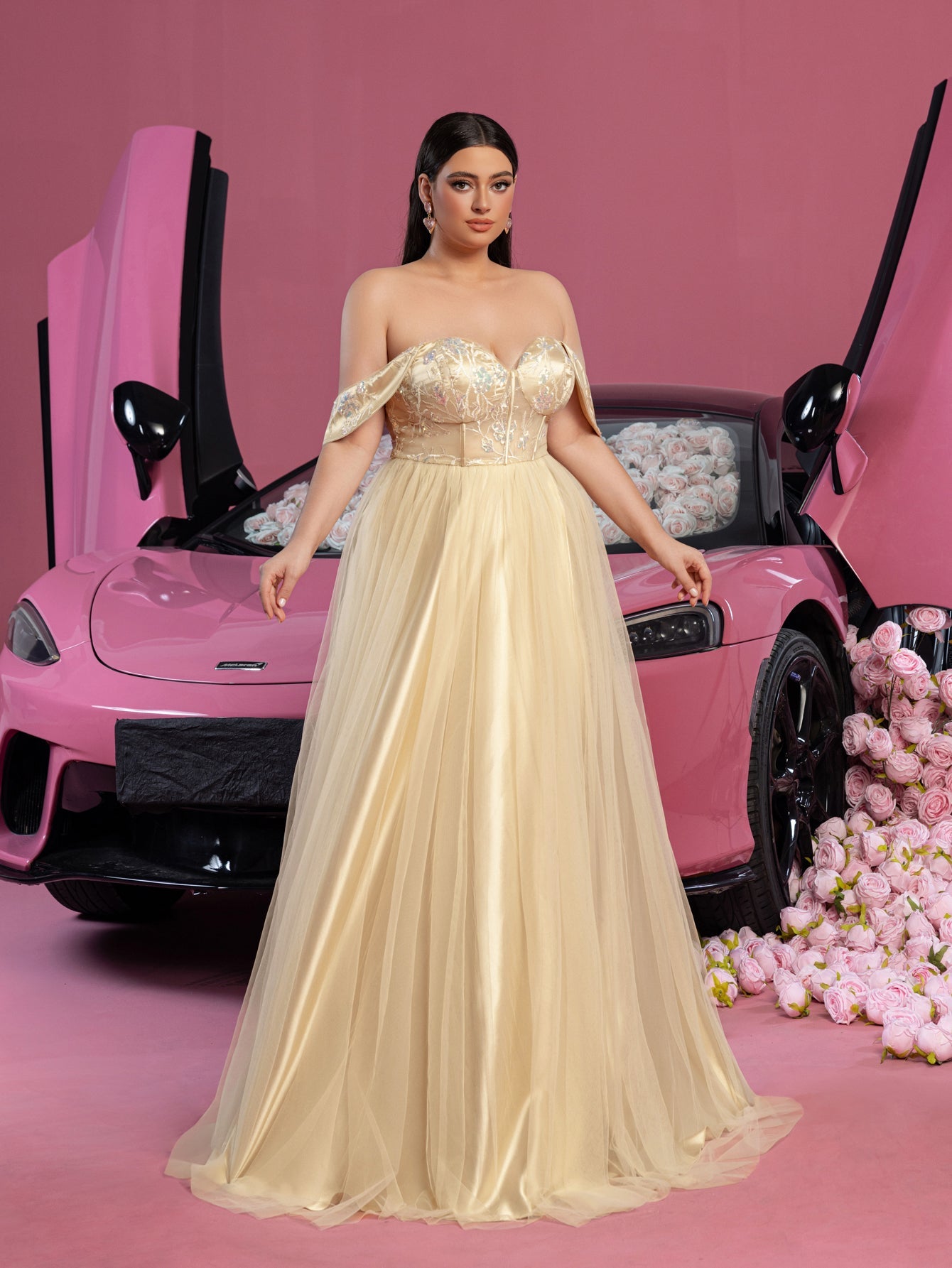 Turn heads with this opulent gown that radiates timeless elegance and bold modernity. The gown features a sweetheart neckline with delicate off-the-shoulder sleeves, perfectly adorned with intricate floral embroidery. The fitted corset bodice with a lace-up back not only provides a tailored fit but also adds a touch of vintage glamour. The flowing tulle skirt creates a soft, ethereal look and is elevated by a high slit, adding drama and sophistication. With its subtle train, this gown is designed to make you feel like royalty.