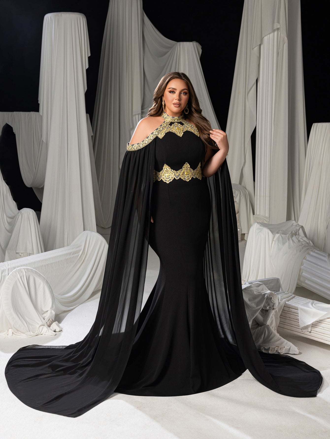✨ Opulent Elegance: The  Mermaid Gown showcases a form-fitting silhouette that accentuates every curve, paired with a dramatic flowing cape for added grandeur. Intricate gold embellishments around the neckline highlight timeless luxury, while the white drape backdrop creates a striking contrast to amplify its visual impact.